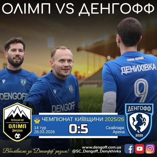 Денгофф КОАФ Чемпіонат Київщини 2025/2630.03.202630.03.2026Dengoff Голи: Мельник Олександр, Сомов Іван, Юзефович Владислав, Миколаюк Євген, Бачинський Віктор. Перемога над “ОЛІМПОМ” в матчі 14-го туру Чемпіонату Київщини.